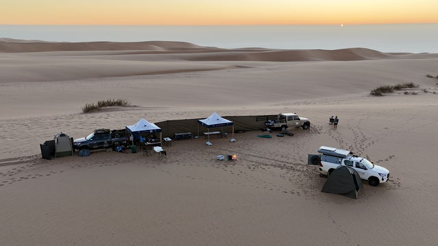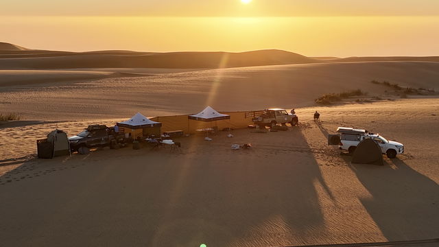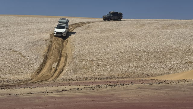 We will briefly stop here to deflate tyres and conduct a safety briefing. We continue along a section of soft sand with characteristic blades of grass. Late afternoon we will set up camp and prepare dinner.