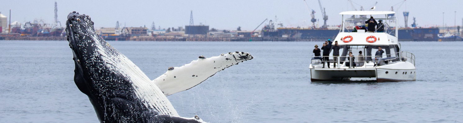 The Marine Desert Adventure gives you the ultimate combination of viewing our marine life on a leisure cruise on the Atlantic Ocean and exploring our fauna and flora with a ride in the breathtaking Sandwich Harbour Area of the Namib Naukluft Park. The day starts with a marine educational cruise on one of our luxury catamarans at 09h00 in search of the marine big 5: Whales, Dolphins, Mola, Leatherback turtle and seals.